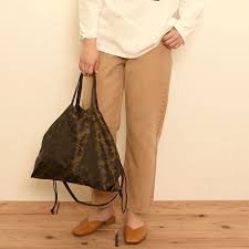 - 迷彩柄のトートバッグを大人カジュアルに組み合わせて使う