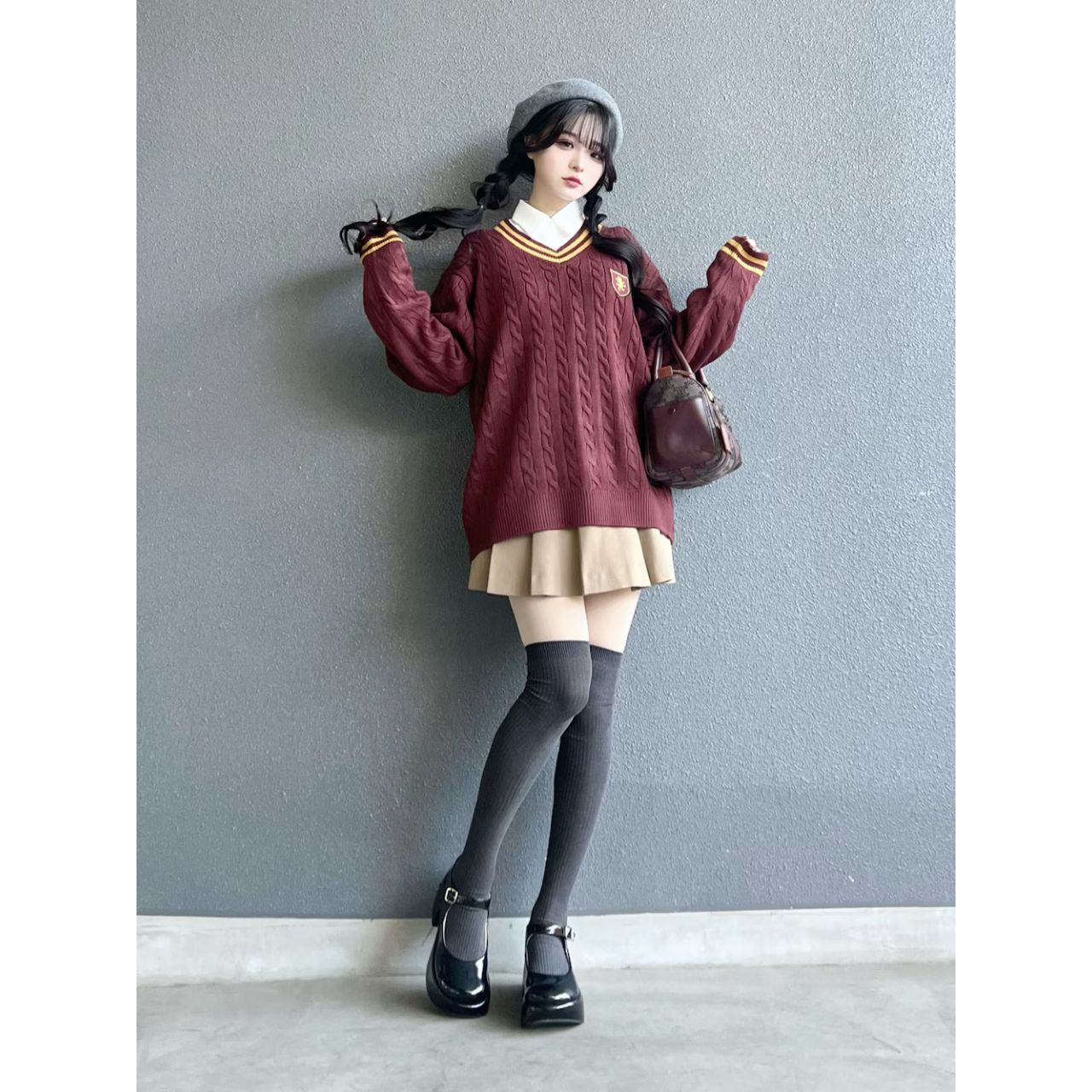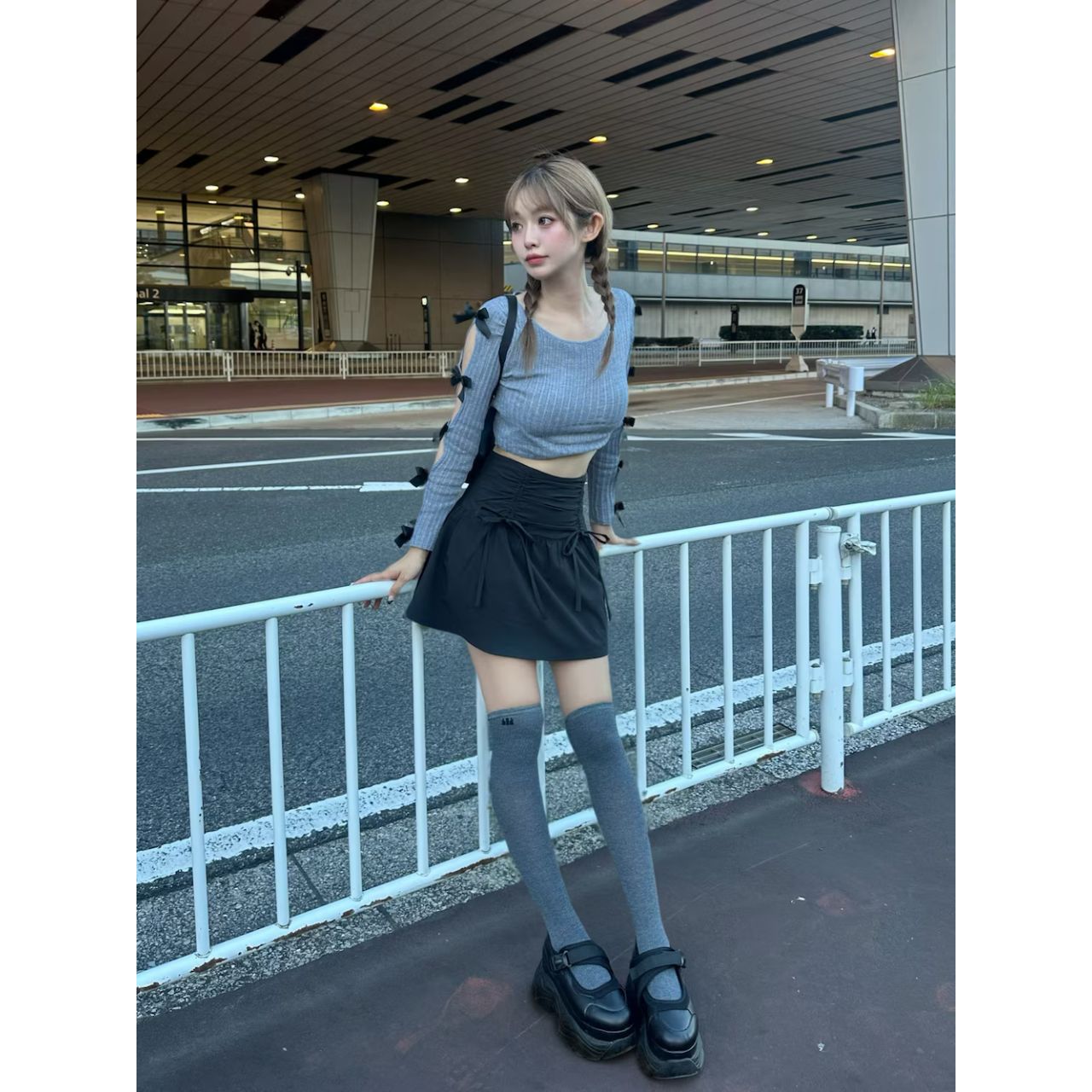 ダークグレーのニーハイソックスを取り入れたコーデなら今の時代でもおかしくない。(20代女性)