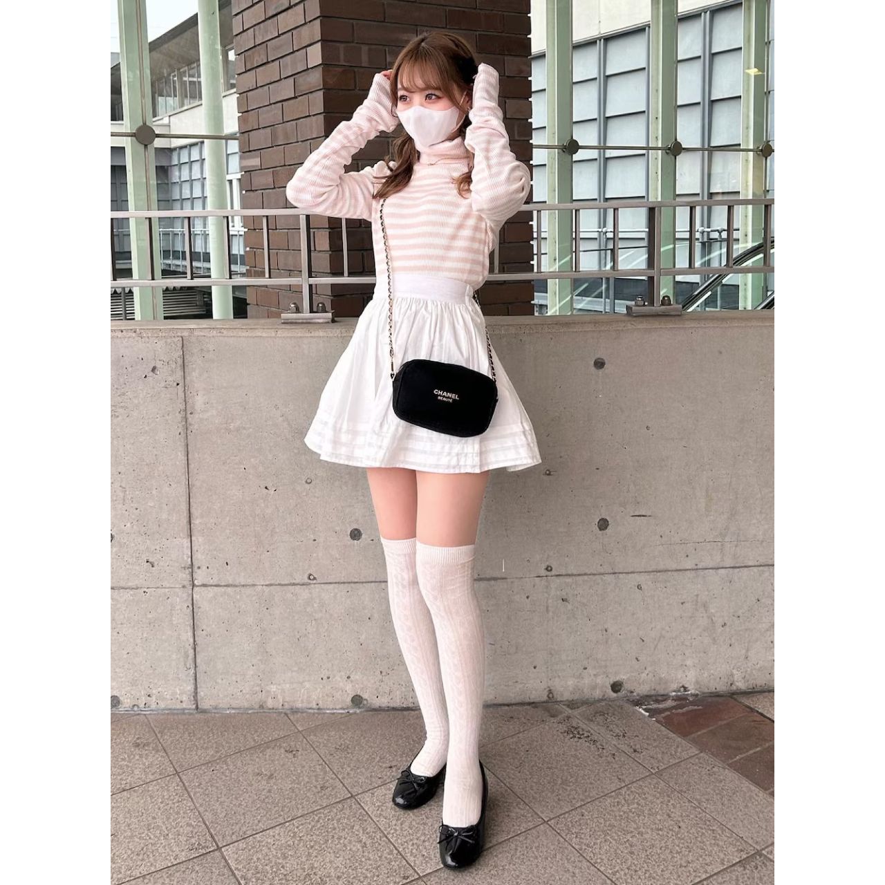 ニーハイソックス+ミニスカは王道のコーディネートだね! 脚を長く見せる効果があっていいよね!