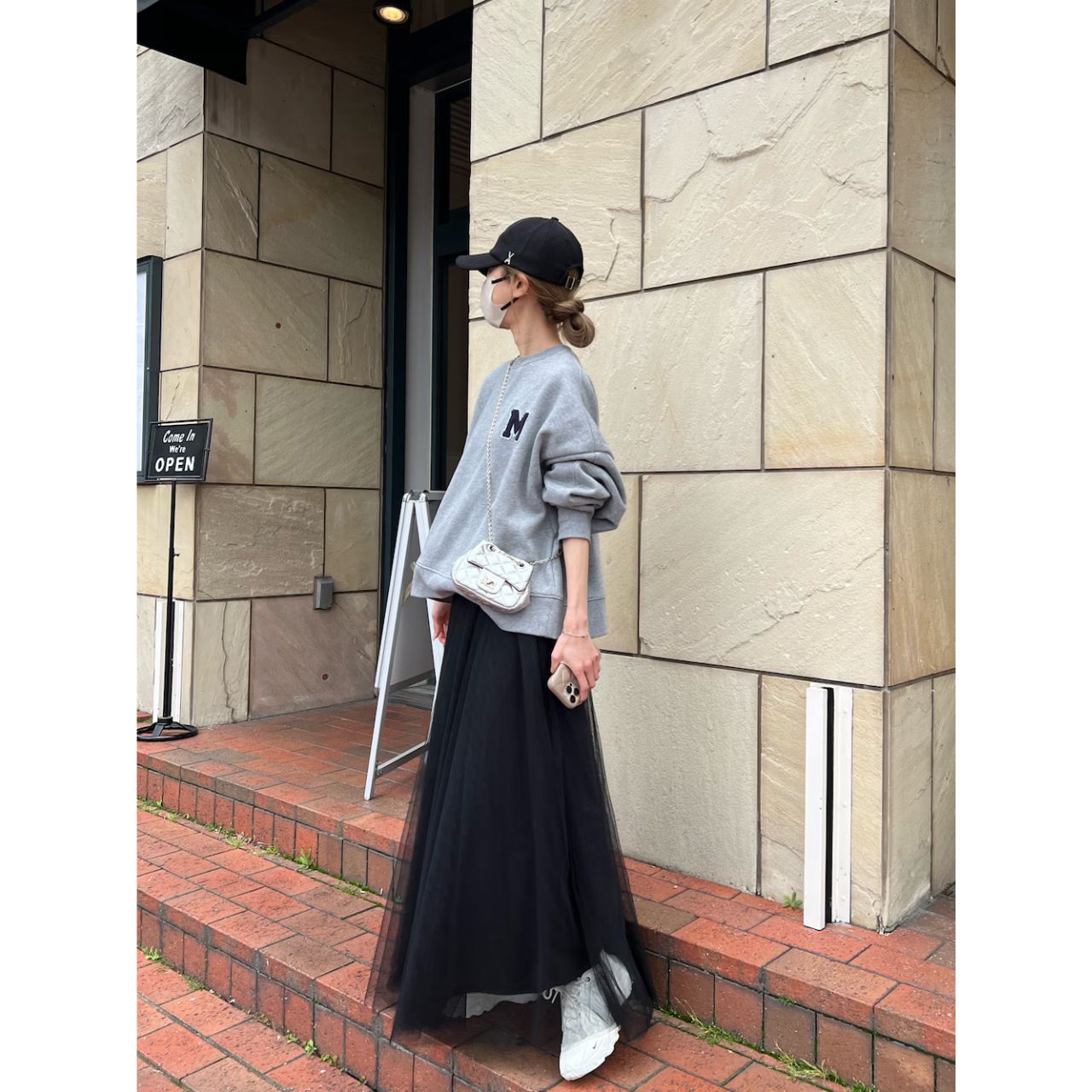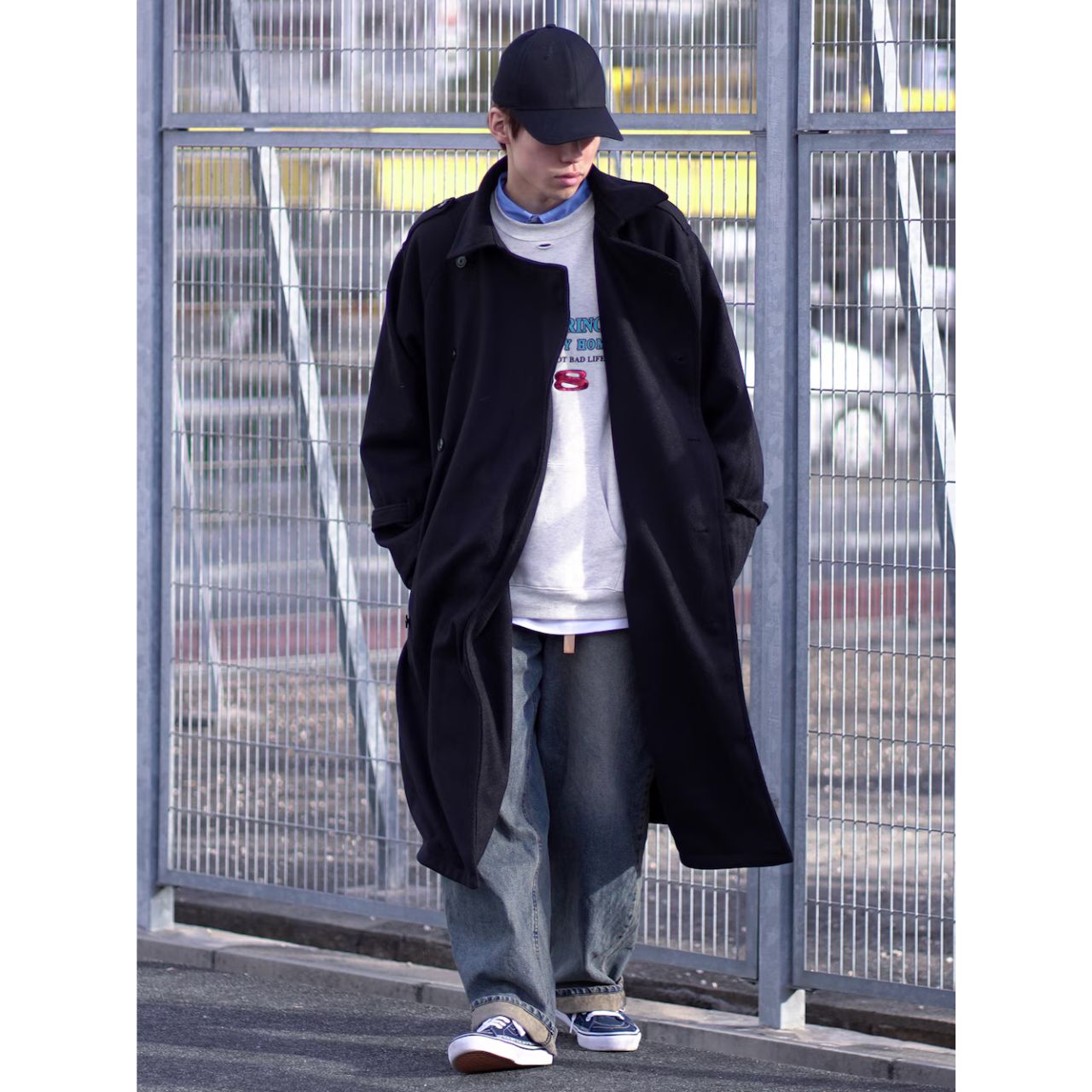 • ロングのスプリングコートにグレーのスウェットを合わせてバザールのギャップを被る